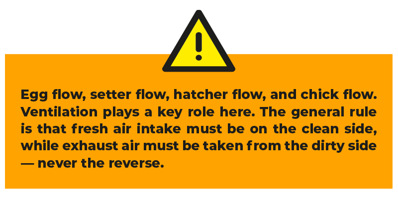 The best way to prevent airborne contamination in a hatchery begins with careful planning during the construction phase, including the building to take advantage of prevailing winds and always following the egg-to-chick flow in accordance with external airflow. Once the hatchery is built, protective measures can still be implemented, such as physical barriers, either natural (trees) or man-made (walls).Regardless of the hatchery’s orientation, it is essential to maintain at least four separate flows and to avoid cross-contamination at all costs — not only for personnel, but also for equipment and especially ventilation.