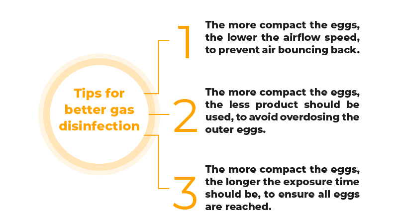 When disinfecting (not only eggs), it is important to understand the basic principles of gas diffusion. For optimal diffusion, we need the correct dosage (concentration), air temperature, and ventilation (distribution). Fast, even distribution of the active ingredient is crucial, especially with aldehydes like formaldehyde, which can cause embryo mortality if poorly managed.When eggs are packed too closely, airflow between them is restricted. Using setter trolleys and trays allows easier air passage, but factors such as airflow speed, exposure time, and contact area must be carefully balanced.