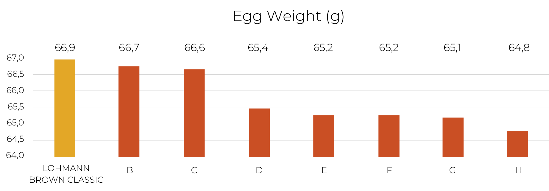 When it comes to profitability, egg size and egg mass play a crucial role in the poultry business.LOHMANN BROWN-CLASSIC’s egg weight reached the highest score, as the chart above shows.