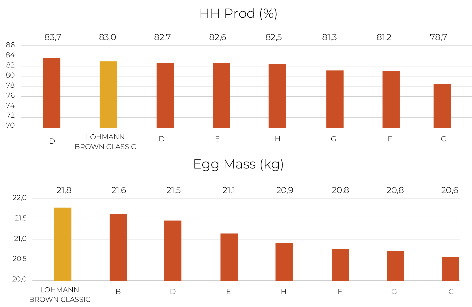 A well-balanced bird combines outstanding first grade egg weight with a high and persisting production, yielding to the eggmass, the money-maker parameter.Thanks the balaced genetics of LOHMANN BROWN-CLASSIC, hen housed production was on top of the varieties, making egg mass the highest.