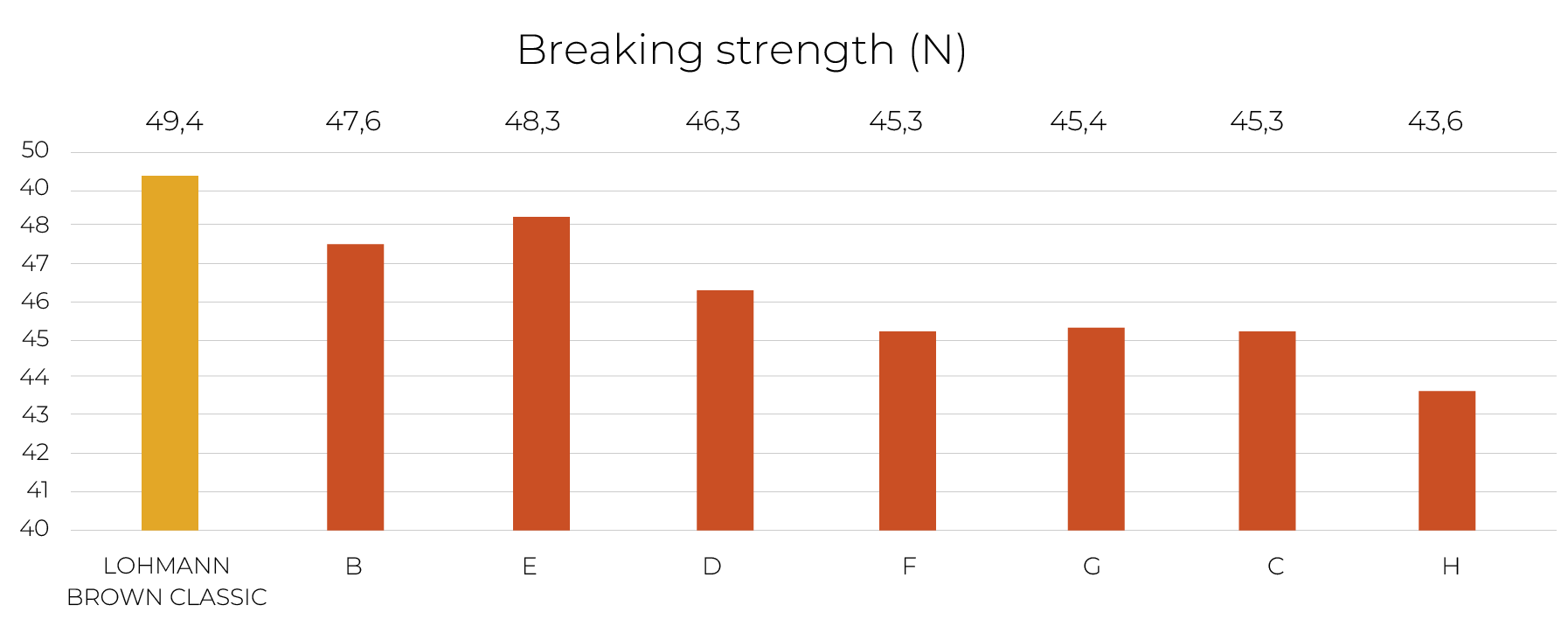 As well known in the egg industry since decades, LOHMANN BROWN-CLASSIC eggs set the benchmark for Shell strength and low percentage of downgraded eggs. As seen in the Table, the average Breaking strength of LB-CLASSIC Eggs are well ahead of all other brown strains in this test.