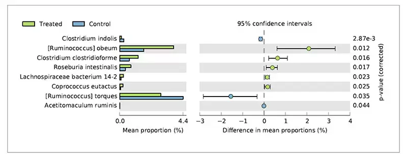 Metagenomic studies can help to interpret the reasons of changes in chicken productive performances associated to nutritional interventions. De Cesare et al. (2017a) observed a significant beneficial effect of the dietary supplementation with Lactobacillus acidophilus D2/CSL (CECT 4529) at the recommended dietary dosage of 1×109 cfu/kg feed on (1) broiler body weight gain between 15-28 days; (2) improved feed conversion rate in the overall rearing period (i.e., from 0 to 41 days); (3) a lower incidence of pasty vents in chickens treated with the probiotic. To explain these observations caecum contents were sampled from treated and untreated birds and submitted to metagenomic shotgun sequencing to look at both taxonomic composition as well as functional genes in both control and treated samples. The relative abundance of Lactobacillus acidophilus in the caeca of treated chickens was comparable with that of the control group probably because the colonization preference of the administered strain is the crop and the small intestine. On the other hand, microbial species producing butyric acid, such as Ruminococcus obeum, Clostridium clostridioforme, Roseburia intestinalis, Lachnospiraceae bacterium 14-2T and Coprococcus eutactus at 41 days displayed a significantly higher relative frequency of abundance in the treated birds in comparison to the control group (Figure 3).Fig 3. Bacterial species significantly differed in chickens treated with L. acidophilus (Treated)